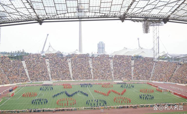 1974年6月13日,1974年世界杯在德国慕尼黑的奥林匹克体育场拉开帷幕。这是开幕式现场的一张远景照片,展示了当时盛大的庆典仪式和体育场的宏伟全貌。